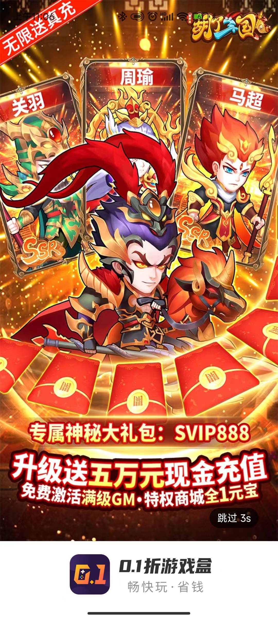 《0.1折游戲盒》全網0.1折手游交易,注冊還送648充值券,免費0元首充、禮包、月卡、滿級VIP、GM特權,助你暢玩精品網游。
